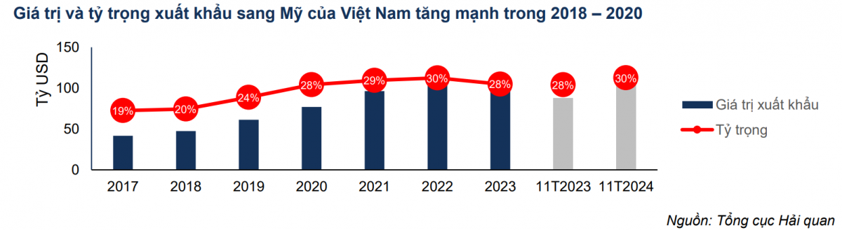 Năm 2024, kim ngạch xuất khẩu của Việt Nam sang Mỹ đạt 405,5 tỷ USD, ghi nhận mức tăng 14,3% so với năm trước. Dự báo năm 2025, tốc độ tăng trưởng xuất khẩu vẫn duy trì ở mức hai chữ số, nhờ vào các ngành hàng chủ lực như dệt may, linh kiện điện tử và gỗ chế biến. Đáng chú ý, nhóm tư liệu sản xuất – hiện chiếm 37% tổng kim ngạch xuất khẩu sang Mỹ – được kỳ vọng tiếp tục duy trì mức tăng trưởng trung bình 40% mỗi năm theo nhận định từ FPTS.